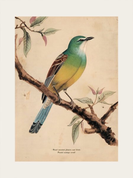 A vividly colored hand-painted bird perches gracefully on a branch, exuding serenity and elegance. The delicate brushstrokes and soft tones perfectly capture the bird's lively expression and the beauty of nature. The subtle background treatment gives the entire image a fresh and refined feel, filled with a tranquil atmosphere, as