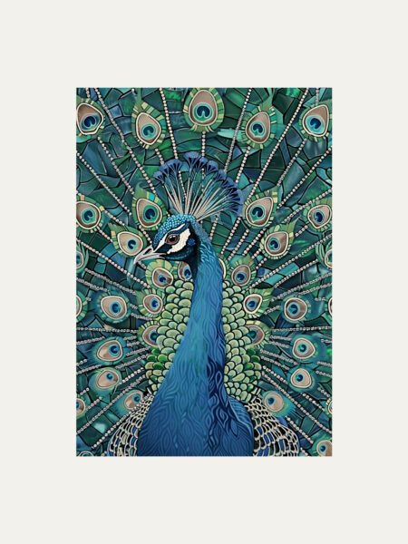 This painting showcases a peacock with its magnificent feathers fully displayed, vibrant in color and intricate in design, offering a visual feast and a sense of joy. The peacock's graceful stance and splendid plumed crown symbolize the beauty and mystery of the natural world.