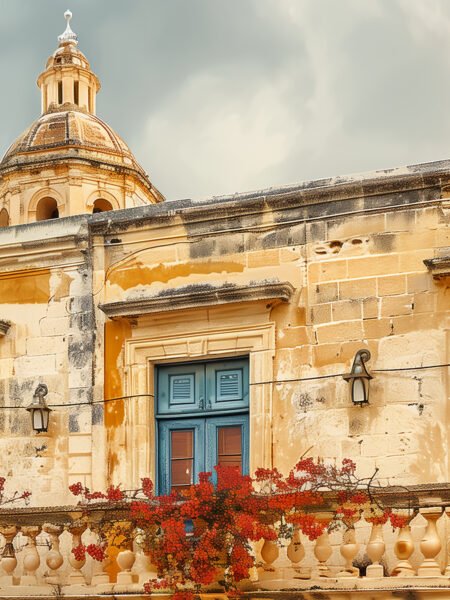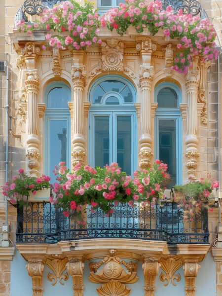 The beautifully adorned building balcony is adorned with clusters of vibrant pink flowers, creating a strong European ambiance. The wrought-iron railings and intricately carved columns complement each other, while the blue windows contrast sharply with the flowers' colors. The rich architectural details offer a sense of historical and modern beauty