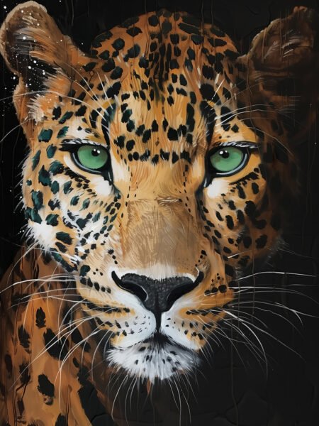 This image features a close-up of a cheetah's face, with piercing green eyes that seem to gaze into the viewer's soul. The spots on the cheetah's fur contrast sharply with the dark background, conveying a sense of power and majesty, as if it is the ruler of the night.