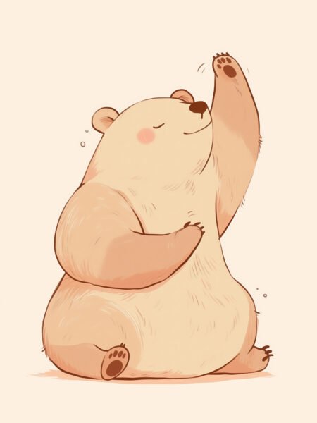 In the picture is a cartoon bear. It closes its eyes, wears a smile, with one hand raised and the other placed in front of its body. It looks lovely. It conveys a relaxed and pleasant feeling, adding a warm and lively atmosphere to the home.