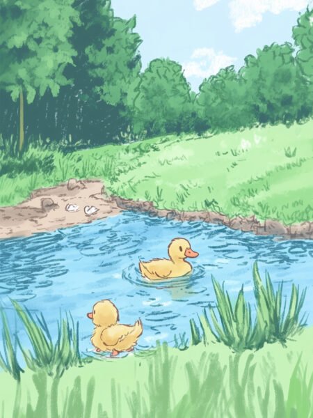 A clear stream flows quietly through green grass as two little ducks paddle calmly, leaving soft ripples behind. Surrounded by trees and gentle sunlight, the scene feels peaceful and warm, capturing a quiet summer moment full of innocence and ease.