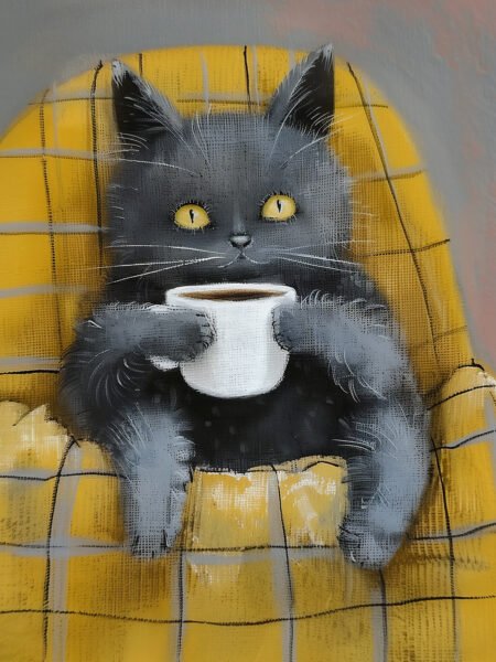 A cute gray cat is sitting on a yellow checkered chair, holding a cup of hot coffee with both paws. The cat's eyes are round, with striking yellow irises, and its expression is both focused and relaxed. The scene is warm and cozy, exuding a sense of comfort and cuteness.