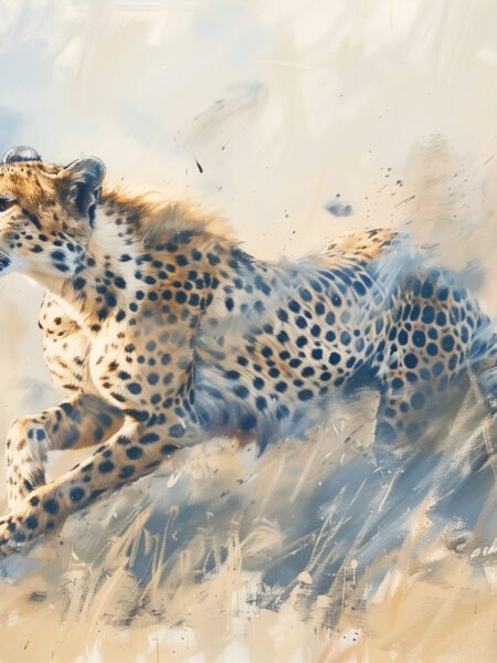 This artwork captures the moment of a cheetah running at high speed across the savannah, filled with dynamism and power. The blurred background highlights the cheetah's speed and agility, as if you can feel the wind rushing past. The artwork uses delicate brushstrokes and realistic colors to showcase the elegance