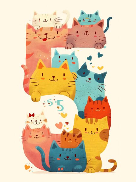 The picture is filled with adorable cats of various colors and expressions, each radiating joy and energy. The vibrant colors and cartoon style create a lighthearted and cheerful atmosphere, with heart shapes in the background adding a touch of warmth. The overall image is full of playfulness and happiness, transporting