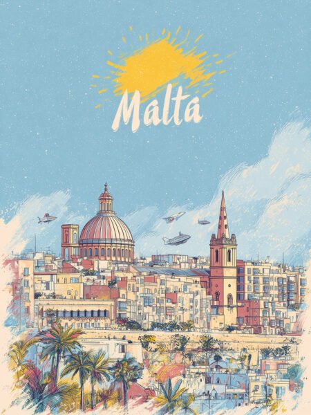 "Sunlit Malta" captures the unique coastline and architectural charm of Malta through soft strokes of colored pencils and watercolor. The sunlight bathes the ancient city and modern buildings, weaving a warm tapestry of light and shadow. The gentle tones and delicate lines bring this sun-soaked land to life, evoking the