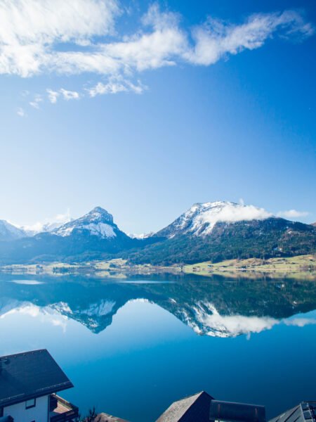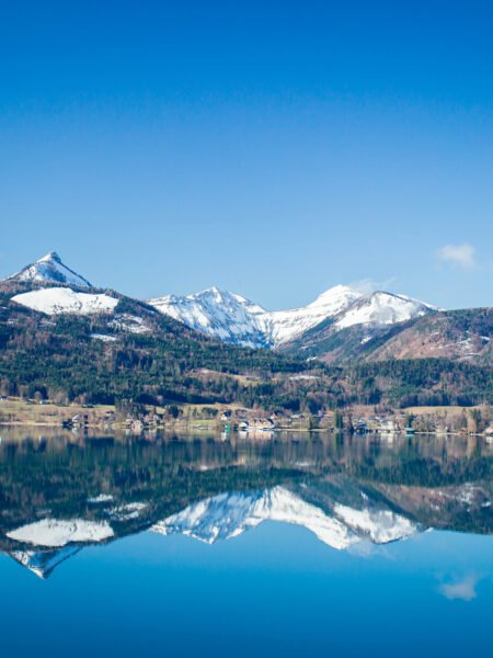This photograph captures a serene lake with a mirror-like surface that perfectly reflects the distant snow-capped mountains. The clear blue sky contrasts beautifully with the snow, creating a sense of purity and tranquility, evoking the serene beauty of nature.