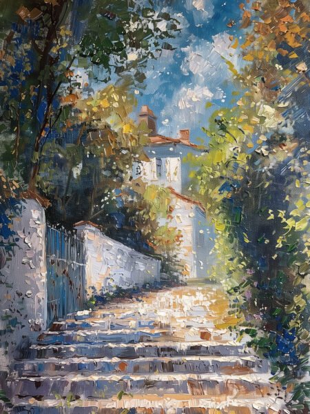 This painting features soft warm tones and simple geometric shapes, depicting an abstract set of architectural stairs. The artwork, with its delicate color gradients and sense of layers, evokes a feeling of tranquility and balance. It seems to invite the viewer to explore the deeper meaning behind each level, experiencing