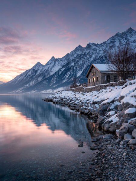 Snow blankets the lakeshore as mountains fade into dusk. A small cabin glows warmly, reflected on the still water. Cool blues blend with soft pinks, creating a c