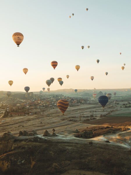 This image captures the stunning sight of countless hot air balloons ascending in the morning light, filling the sky with vibrant colors. Below lies a peaceful town and vast fields. The scene is full of energy and romance, as if stepping into a dream-filled fantasy world.