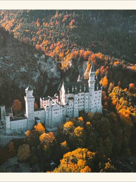 This image features a white castle nestled in a forest during late autumn, surrounded by trees ablaze with golden and orange hues. The castle stands majestically in the mountains, with sunlight casting a warm glow on its walls, creating a mysterious and romantic atmosphere, as if leading one into a