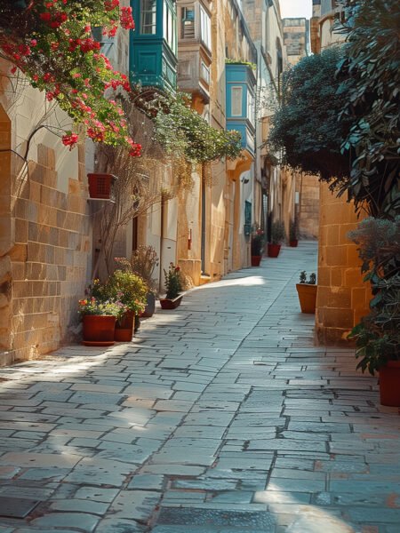 This photograph showcases the enchanting scenery of a quiet corner in Malta. The ancient stone buildings are adorned with a variety of flowers and greenery, adding vibrant life to this serene path. Sunlight falls on the neatly arranged cobblestones, creating a warm and peaceful atmosphere. This street is not only