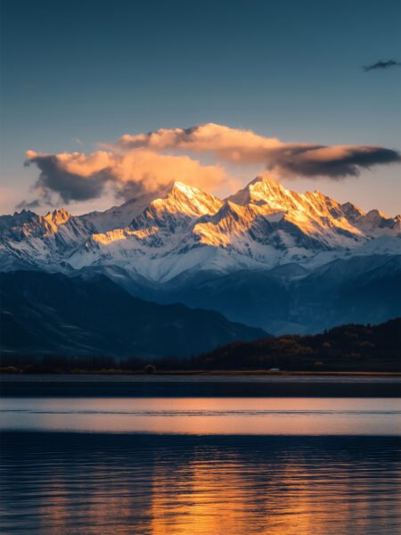 This painting showcases the splendid view of Meili Snow Mountain under the sunlight. The majestic snow-capped peaks are illuminated by golden sunlight, reflecting beautifully on the lake surface. With clouds dotting the sky, the painting offers rich layers of color, evoking a sense of tranquility and grandeur.