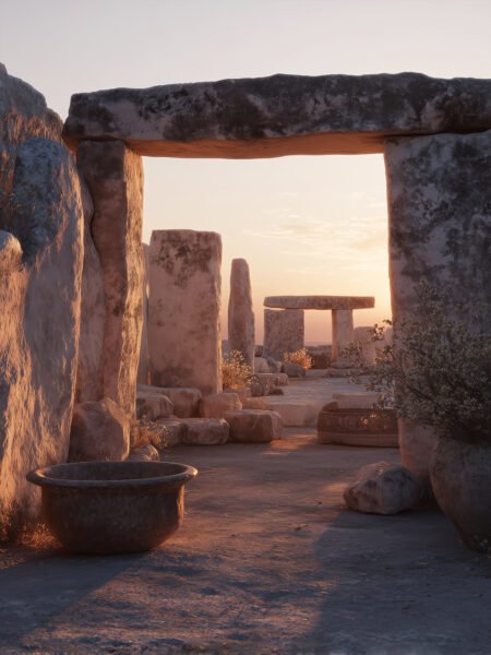 he sunset pours through the gateway of the megalithic temple, as if light itself has traveled across millennia to illuminate the echoes of a prehistoric civilization. Each stone carries faith and memory, standing in silent vigil through the passage of time.