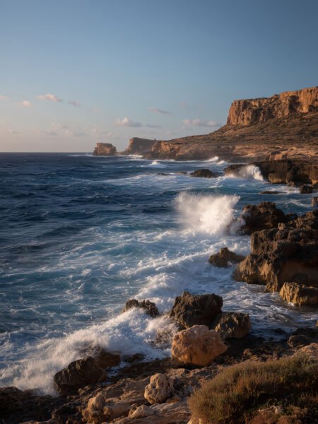 "Song of the Waves" captures the magnificent landscape of Malta's coastline. The azure sea clashes with the rocks, and the waves crash against the reefs, playing nature’s melody. The fading sunlight casts a golden hue over the sea, weaving together the tranquility and power of the coastline. Through subtle shifts