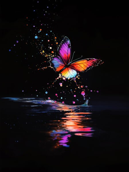 In the picture, a brilliantly - colored butterfly flutters against a black background. Colorful splashes surround it, and the beautiful reflection of the butterfly is shown on the water below, full of dreamy and lively feelings.