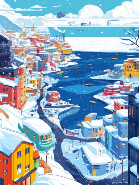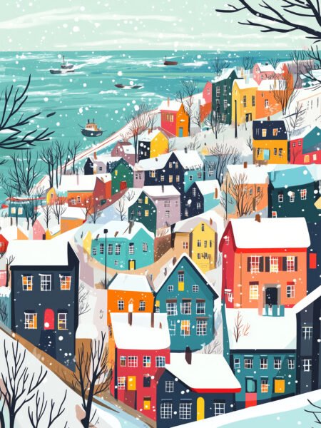 This illustration depicts the charming scenery of a seaside town in winter. Colorful houses are arranged in a picturesque manner, with snow-capped roofs. The distant sea sparkles, dotted with a few boats, and falling snowflakes create a romantic and serene atmosphere.