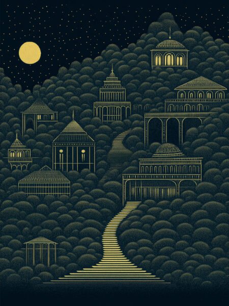 This decorative painting presents a fantastical scene of mountain village under the moonlight, with intricate buildings and winding staircases outlined in golden lines against a dark background speckled with stars, creating a mysterious and dreamy atmosphere.