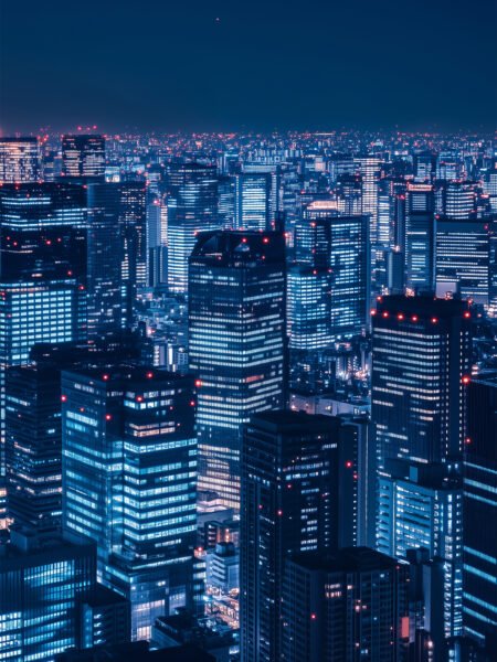 At night, the city becomes an ocean of light. Dense high-rises glow in cool blues with scattered red sparks, expressing rhythm, structure, and the restrained yet relentless energy of modern urban life.