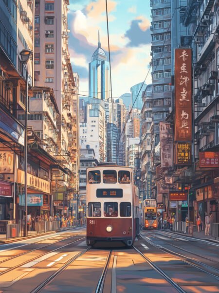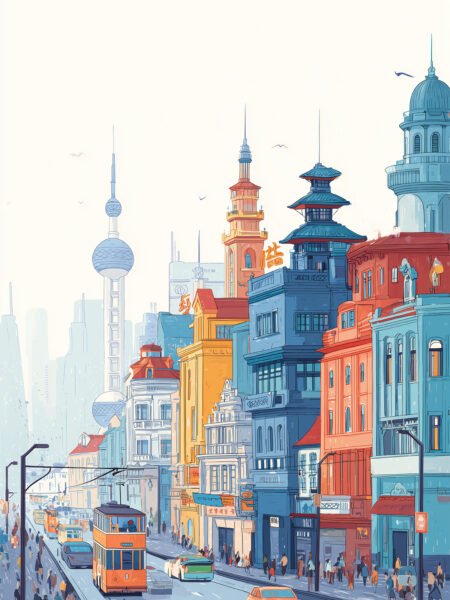 The artwork captures a Shanghai street scene where trams move between historic buildings and modern skyscrapers. Daily life flows calmly yet confidently, blending old Shikumen charm with the city’s forward-looking, cosmopolitan spirit.