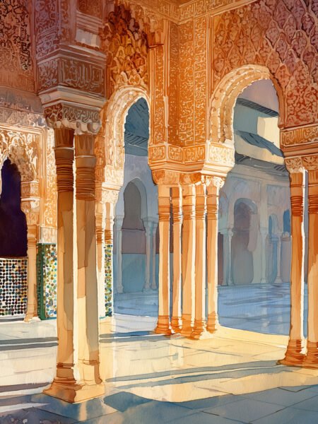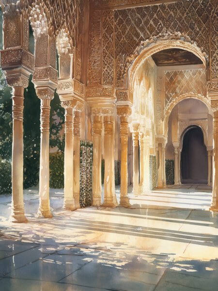 The arcade of the Alhambra glows in sunset tones, as golden motifs shimmer in radiant light. Shadows dance across patterned tiles, revealing the Moorish architecture’s elegance and splendor.