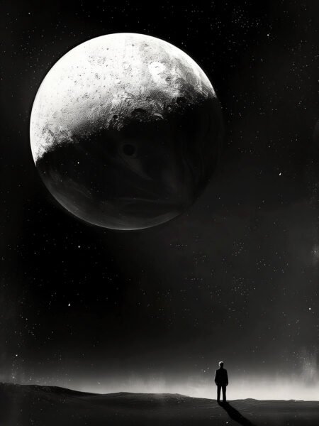This black and white image depicts a person standing on the lunar surface, gazing at the enormous and mysterious moon. The starry sky is silent and vast, conveying a sense of solitude and awe, highlighting the smallness of humans in the infinite expanse of the universe.