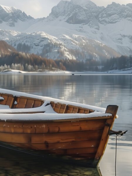 This image features a small boat moored on a lake, covered with a thin layer of snow. The backdrop of majestic snow-covered mountains and serene waters creates a scene full of tranquility and solitude, evoking the calm and peaceful essence of winter.
