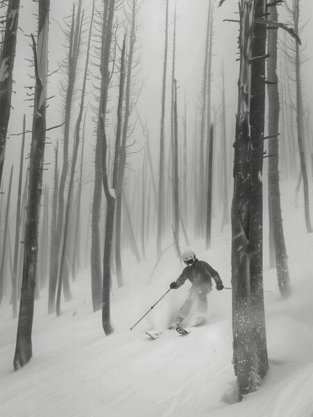 This picture shows a skier speeding through a misty forest. The bare tree trunks stand quietly in the fog, while the skier's silhouette carves a dynamic path through the snow. The image conveys a beautiful contrast between adventure and tranquility.