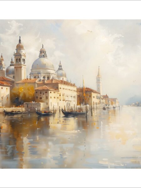 This painting depicts Venice in the early morning, with majestic buildings and gently floating gondolas by the tranquil canal. The soft morning light casts a dreamy glow on the water and architecture, creating an enchanting atmosphere. The domes and bell towers in the distance appear hazy in the mist, adding