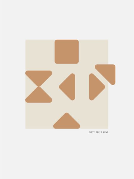 This abstract artwork features simple red geometric shapes arranged on a light background. Each shape is uniquely positioned, creating a harmonious visual effect. The illustration conveys a sense of calm and meditation, as if inviting the viewer to find balance and tranquility within simplicity.