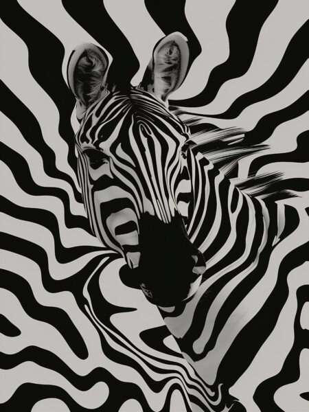This striking artwork features a zebra with its black and white stripes perfectly blending into a wavy patterned background. The zebra's stripes interact with the background lines, creating a psychedelic and dynamic visual effect. The piece cleverly uses contrast and patterns, making viewers feel as if they are entering a