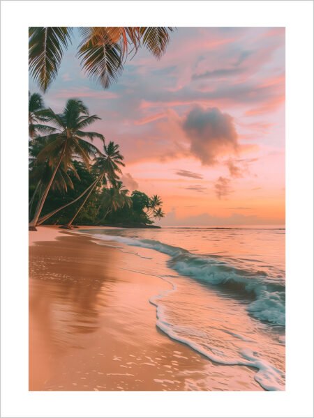 This painting depicts a tropical beach with palm trees swaying in the soft glow of the sunset. The waves gently lap the shore, and the sky is painted in beautiful shades of pink and orange. The entire scene evokes a sense of tranquility and relaxation, making one feel as if