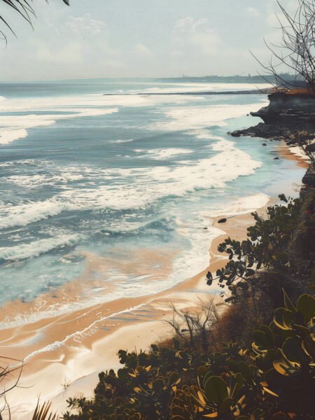 This photograph captures a beautiful morning seashore scene, with sunlight casting a glow on the waves and sandy beach. The seawater appears clear blue-green, and the waves gently lap the shore, creating a soothing sound. The foreground's green vegetation adds depth to the image. The distant coastline fades into a