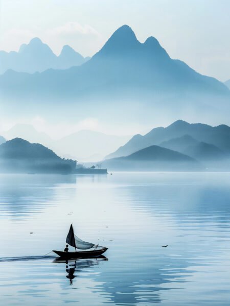 This photograph captures a serene scene of a fisherman rowing a small boat on a calm lake. The distant mountains are shrouded in a light mist, layered and beautiful like an ink painting. The morning sunlight filters through the fog, casting a soft glow on the tranquil lake, with the