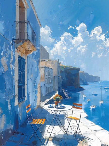 This artwork portrays a small town by the coast, with the morning sunlight bathing the blue buildings and outdoor furniture. The calm sea in the distance, dotted with a few anchored boats, adds to the tranquility of the scene. The painting exudes a serene and leisurely atmosphere, evoking the feeling
