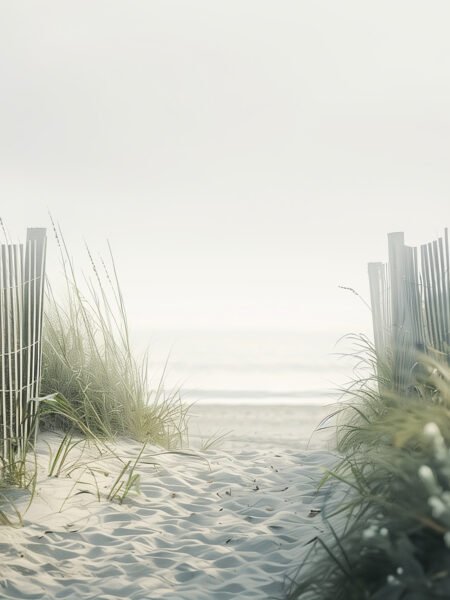 This image depicts a path leading to the beach, flanked by tall beach grass and simple fences, with the waves faintly visible in the distance. The scene exudes tranquility and harmony, evoking a sense of being in a serene haven, providing a feeling of relaxation and peace.