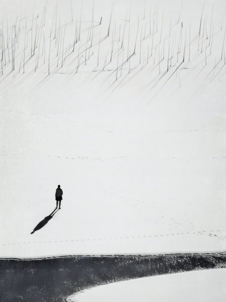 This image depicts a solitary figure walking across a vast snowfield. The barren branches in the distance and the dark water underfoot add depth to the scene, with the silent snow reflecting a sense of loneliness and contemplation, as if time has frozen at this moment.