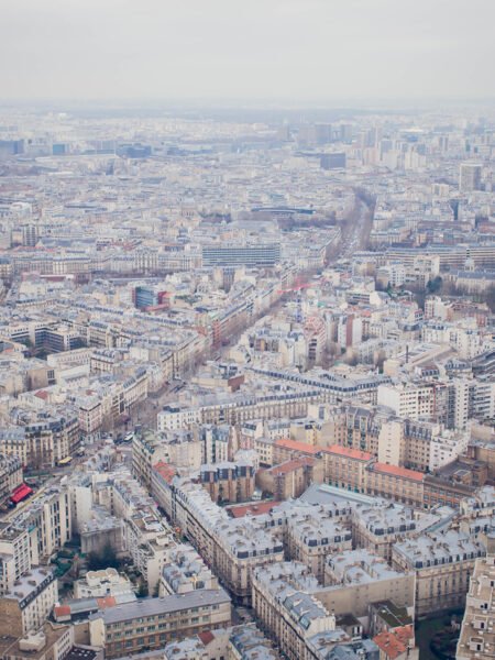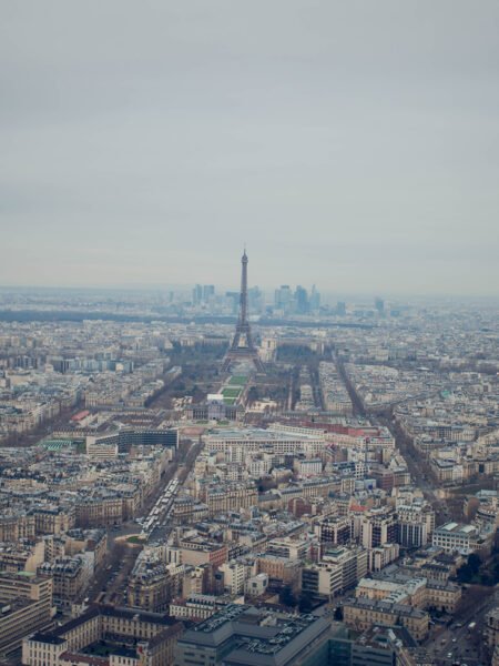 This image offers a panoramic view of Paris, with the Eiffel Tower standing tall at the center, dominating the scene. The surrounding buildings and roads are neatly arranged, showcasing the order and beauty of the city. The slightly overcast sky adds a sense of calm and depth to the atmosphere.