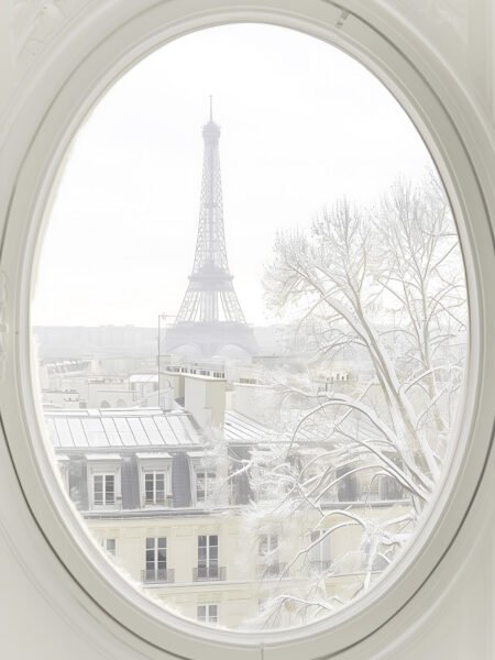 This photo captures a winter scene of Paris through a circular window, featuring the Eiffel Tower in the distance and snow-covered trees. The overall cool tones convey a sense of tranquility and romance, as if placing the viewer in a fairy tale, experiencing the purity and beauty of winter.