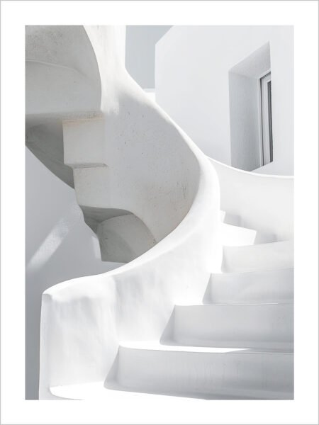 This image showcases a smooth, white staircase winding upward, exuding modern and minimalist beauty. The soft lines and pure white tones create an atmosphere of tranquility and peace, evoking a sense of transcendent beauty.