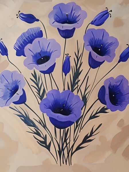 This artwork depicts four violet flowers against a soft gray background. Each flower showcases unique shades of purple and delicate brushstrokes, highlighting the beauty and texture of the petals. The simple color palette and fresh composition create a tranquil and elegant atmosphere, evoking a sense of harmony and the beauty