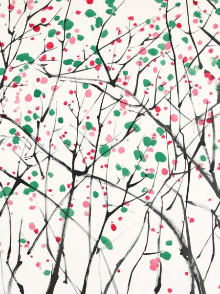 With a white background, the black branches wind and spread, dotted with spots of red, green, pink and other colors, like lively notes. The whole picture is fresh and elegant, adding an artistic atmosphere to the home.