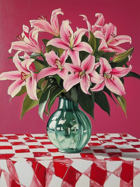 In the picture, a green vase is filled with pink lilies in full bloom. The vase is placed on a red - and - white checkered tablecloth, with a magenta background. The whole picture is colorful, adding a warm and romantic atmosphere to the home.