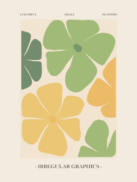 This image showcases small flowers in various colors with an irregular graphic design. The color combination and shapes of the flowers evoke a sense of relaxation and joy, as if one is in a spring garden. This design brings a refreshing visual feel and a pleasant mood.