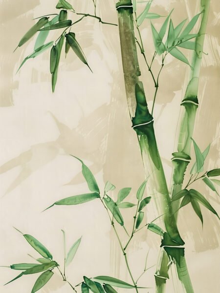 The painting depicts beautifully shaped bamboo, with green stalks and leaves standing out against a subtle background. The delicate brushstrokes and soft colors highlight the resilience and elegance of the bamboo, evoking a sense of freshness as if you can smell the forest. The calligraphy on the right adds a