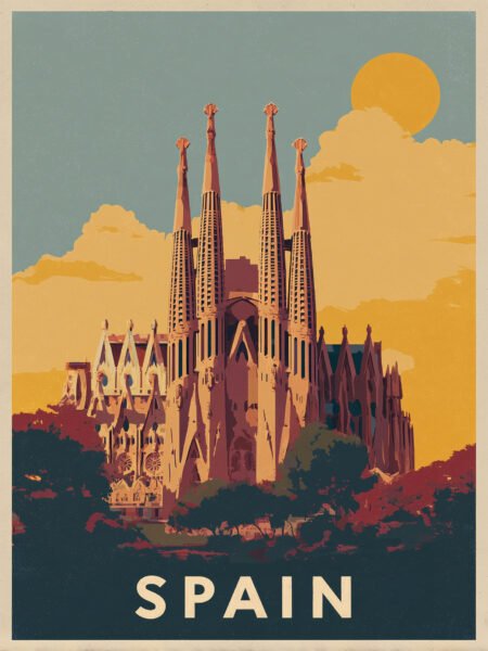 The artwork showcases Barcelona’s charm in retro tones. Classic vintage cars are in the foreground, while the iconic Sagrada Familia with Gaudí - style architecture, trees, and other buildings form the background. Warm skies and dark structures contrast, evoking the city’s retro allure and artistic vibe.