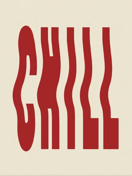 The wavy red "CHILL" lettering stretches gracefully over a cream background, simple yet rhythmic. The distorted lines silently convey a sense of relaxation and freedom, evoking a light and carefree atmosphere.