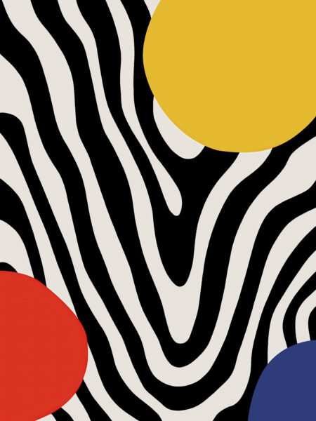 The black-and-white zebra stripes ripple like flowing rivers, brimming with movement. Bold yellow, red, and blue circles disrupt the order, injecting vivid rhythm and visual tension. It feels like an abstract stage where color dances and lines perform — a striking burst of modern artistry for any interior.