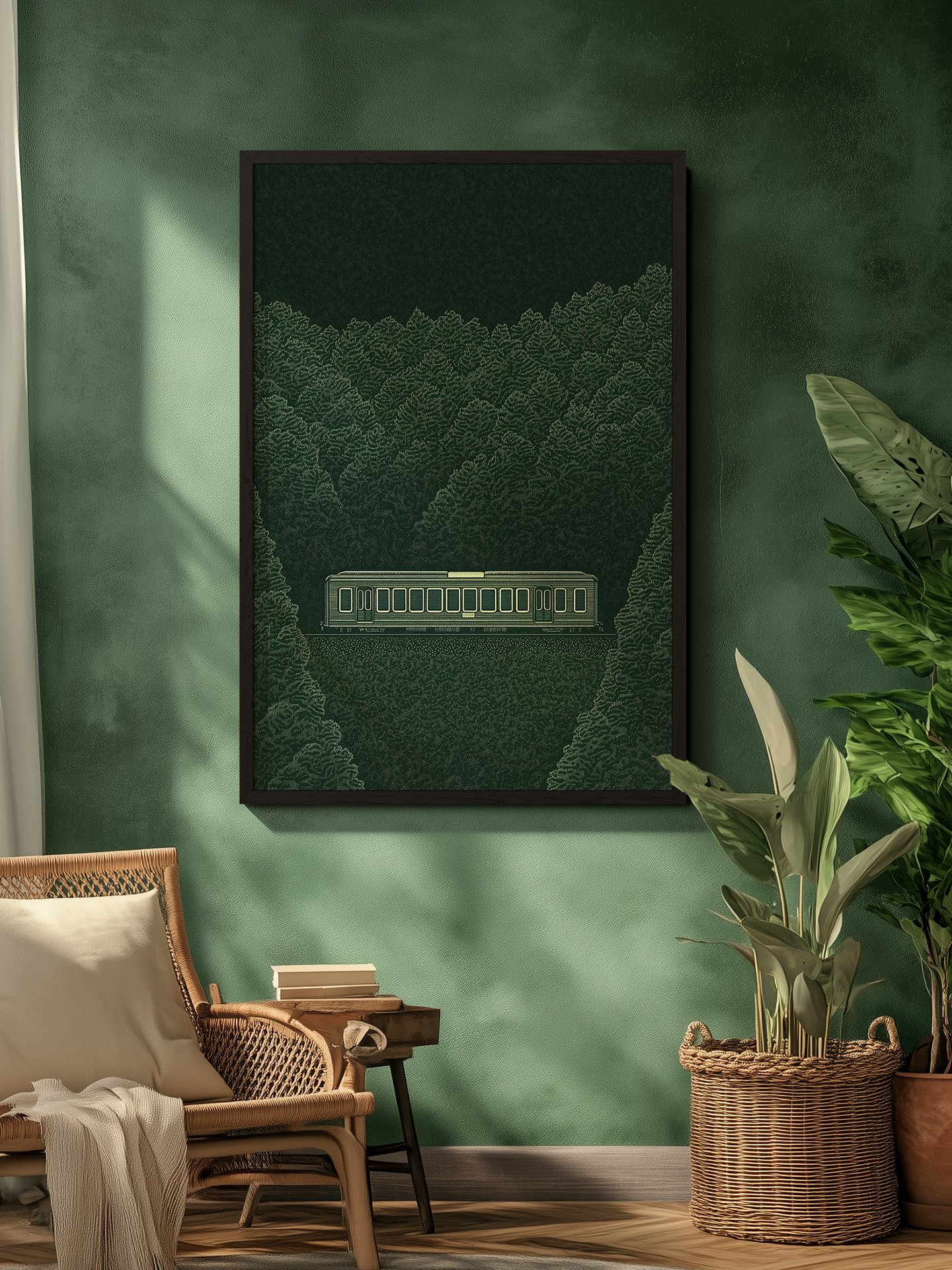 In this decorative painting, a vintage train silently glides through a dense forest, with a deep green color palette creating a mysterious and tranquil atmosphere, as if transporting the viewer to a secluded haven away from the hustle and bustle.