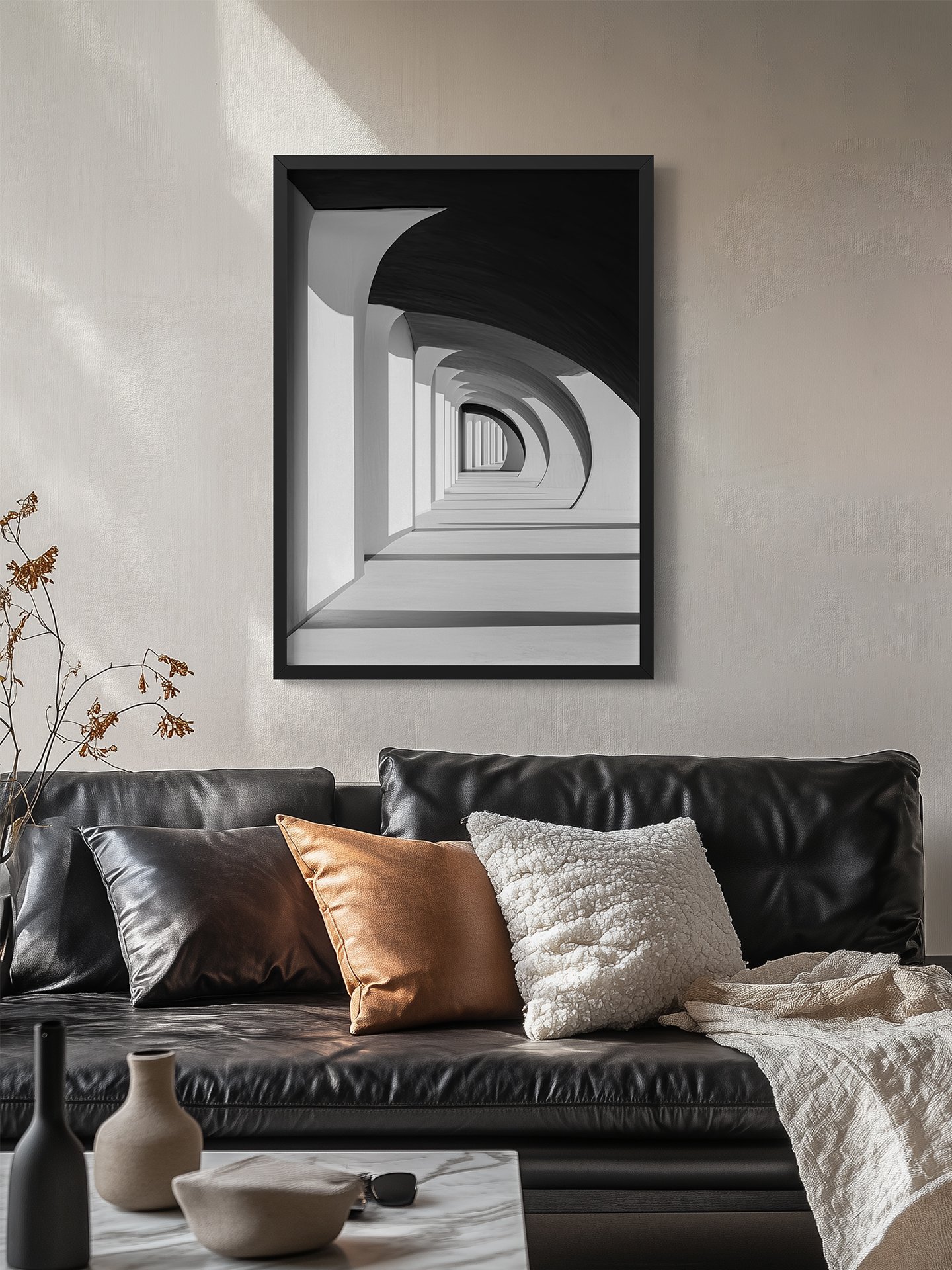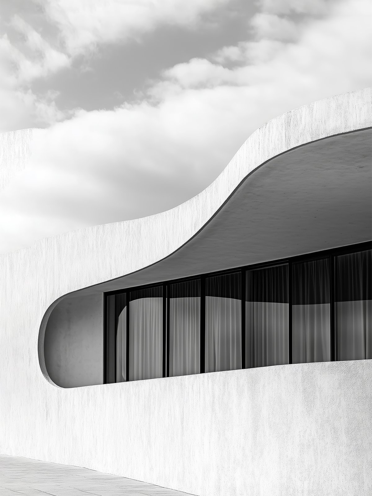A smooth architectural curve unfolds beneath the sky, where white concrete meets dark glass. The restrained composition creates a sense of calm, clarity, and quiet confidence rooted in modern design.